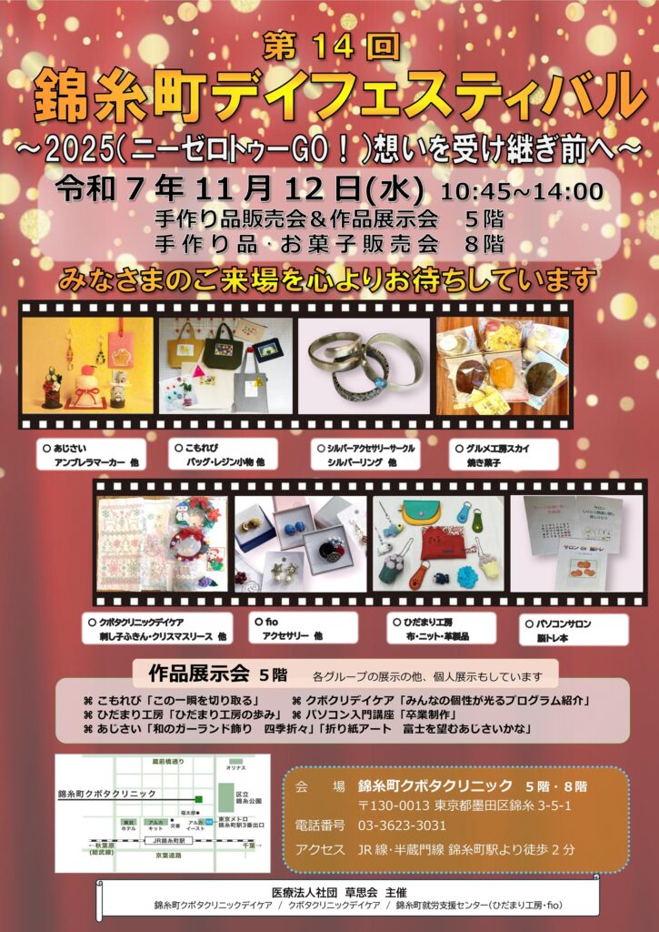 法人内のデイケア・B型事業所による5階「作品展示」と「手作り品販売会」を予定しています。